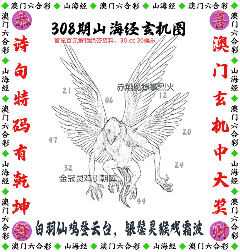 308期:【山海经玄机】开兔39 解释:赤焰魔猿掌烈火,金冠灵鸡引朝晖解狗马鸡 解料:白羽仙鸡登云台,银鬃灵猴戏霜波解鼠兔虎 综合:狗马鼠兔虎鸡 |